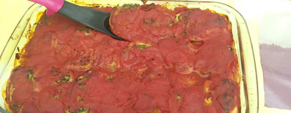 Ajoutez dessus l'eau et la sauce tomate, tout doit être bien couvert.
